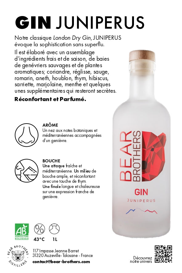 Le Gin Bio Juniperus, notre gin haut de gamme, est un spiritueux français élaboré à partir d'alcool de blé bio et d'eau de source des Pyrénées. Nous utilisons du genièvre sauvage récolté à la main à plus de 1000 m d'altitude ainsi que des agrumes d'exception dont le rare citron caviar. Nos ingrédients sont mis en valeur par la distillation en alambic Stupfler®. Ayant uniquement recours à des fruits frais, nos recettes sont soumises aux saisons et à la qualité des récoltes.
