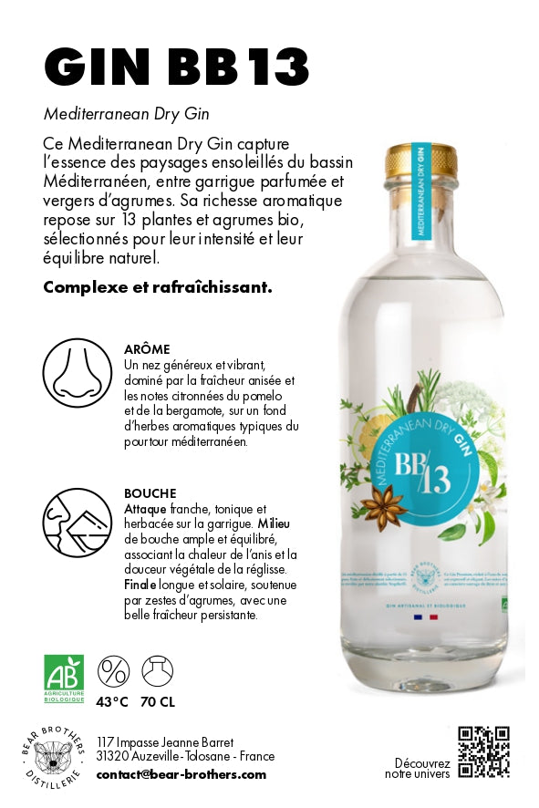 Ce Mediterranean Dry Gin puise son caractère dans 13 plantes et agrumes bio soigneusement sélectionnés. Entre garrigue parfumée et vergers d'agrumes, il marie les notes fraîches d’anis, de genièvre et d’absinthe aux accents méditerranéens du thym, romarin et sarriette, relevés par les zestes lumineux de citron, bergamote et pomelo corse. Un équilibre subtil entre intensité aromatique et fraîcheur solaire.
