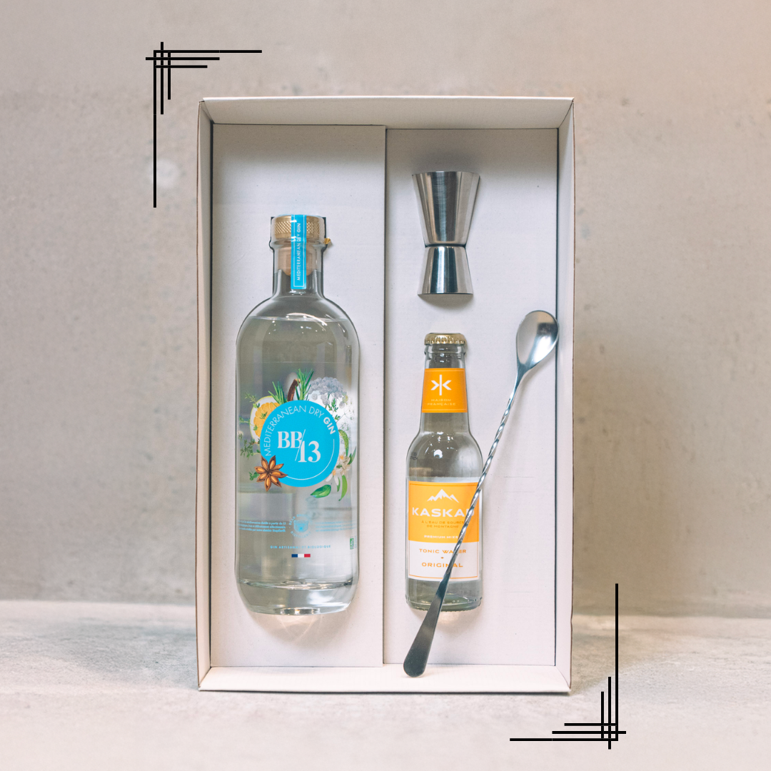 Faites plaisir à vos proches pour les fêtes de fin d'année avec ce coffret cadeau Gin BB13 qui vient avec son doseur, sa cuillère à cocktail et sa bouteille de tonic Kaskad.