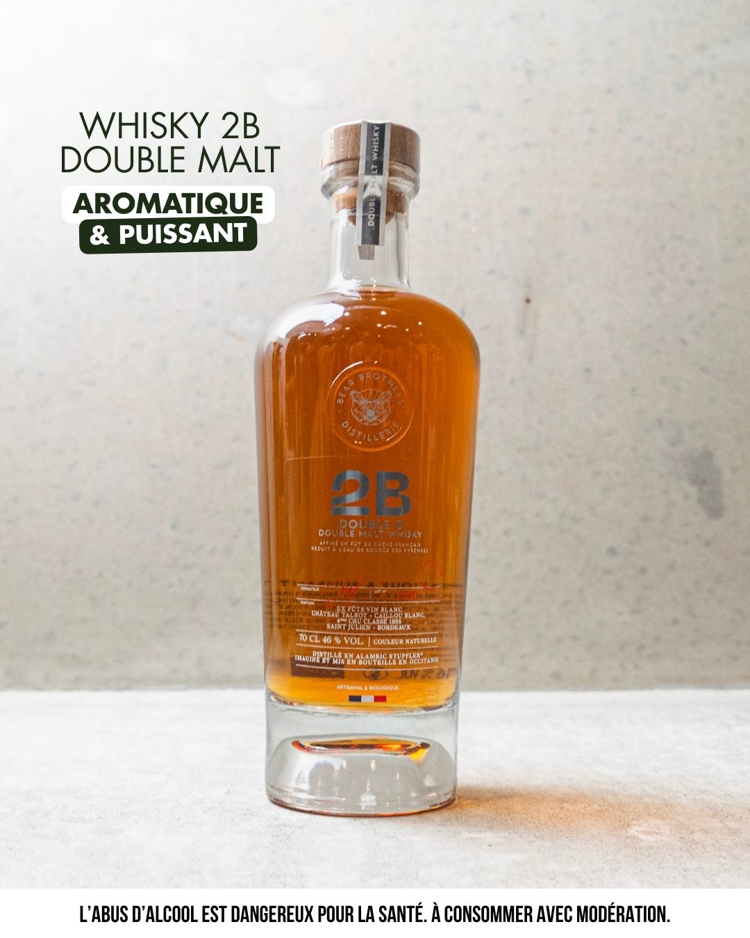 Medaillé d'or 2025 au concours général agricole dans la catégorie Whisky de France Malt et aussi Or lors des French Drinks Awards 2025 , le whisky 2B Double Malt, whisky signature de Bear Brothers Distillerie, est biologique et vieilli en ex-fûts de vin blanc du Château Talbot –Caillou Blanc. Ce Double Malt reflète le savoir-faire artisanal français, offrant un nez élégant et une bouche ample.